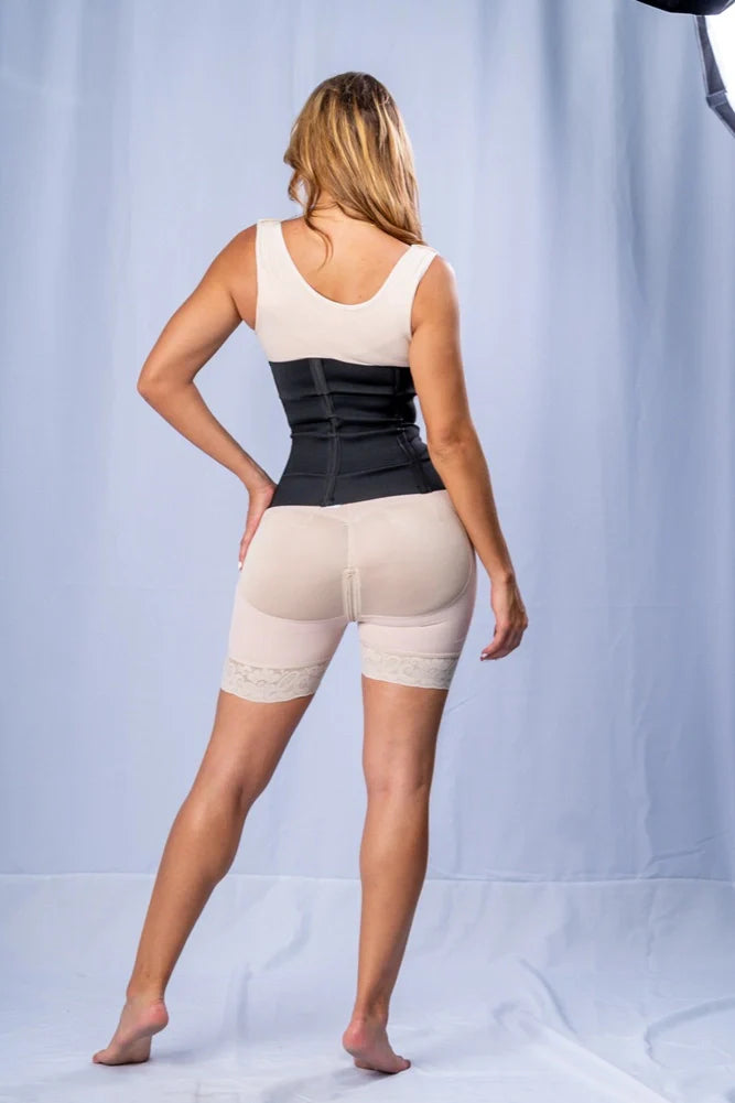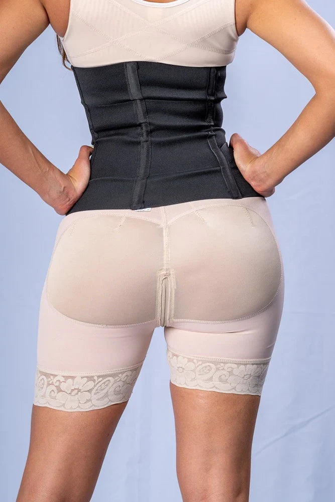 Proporciona una compresión localizada en abdomen y zona lumbar para definir la figura tipo reloj de arena y brindar soporte postural.